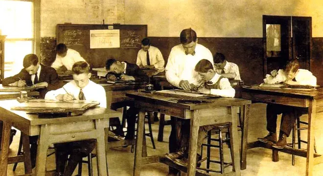 Reverand John Hugh Diman (1863-1949) had a dream to provide vocational education in Fall River. In August of 1912, he attended a Fall River school committee meeting where he offered to equip and supply vocational instruction for one year with a personal donation of $2500. One room was supplied by the school committee at the McDonough School. For three years, Father Diman supervised the program and visited the class weekly.